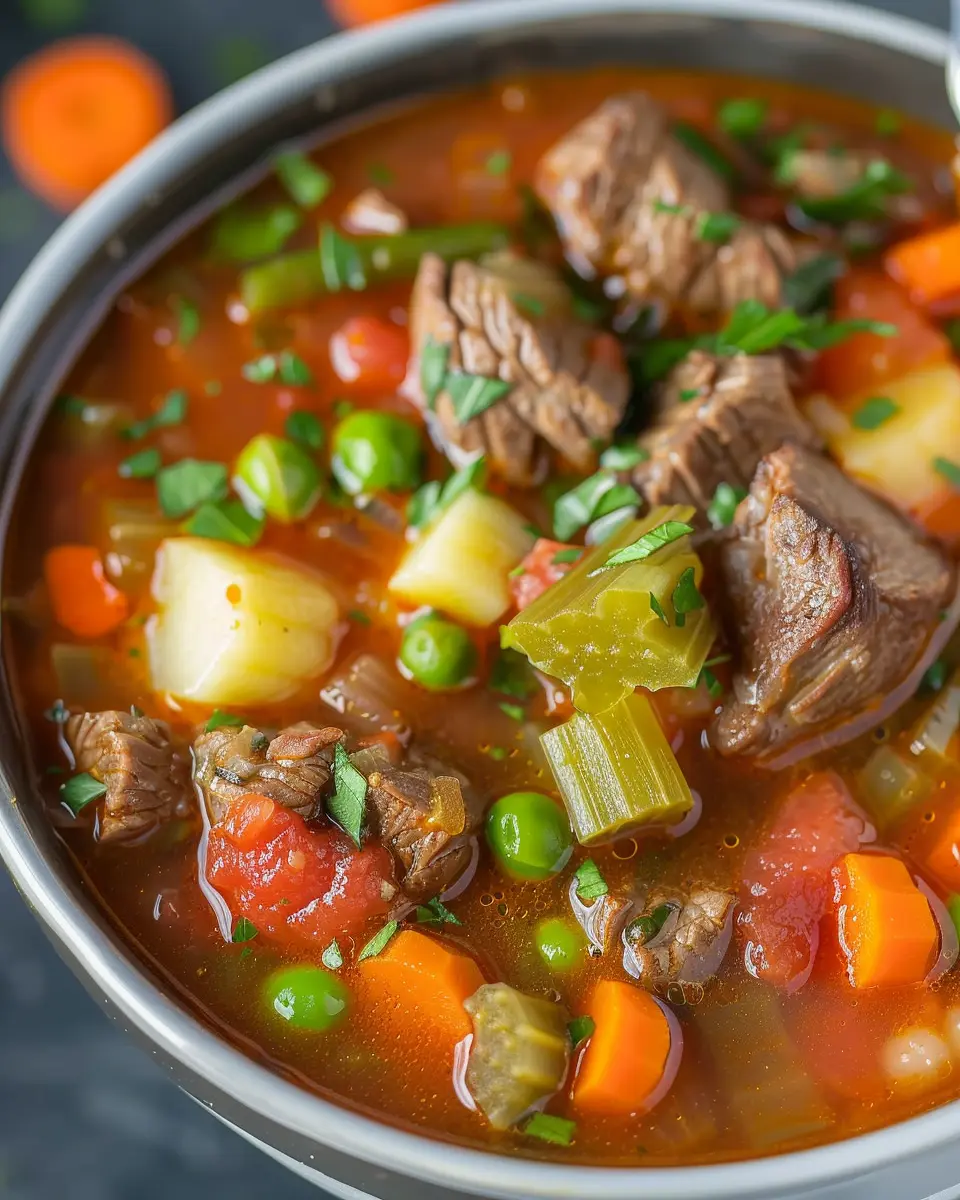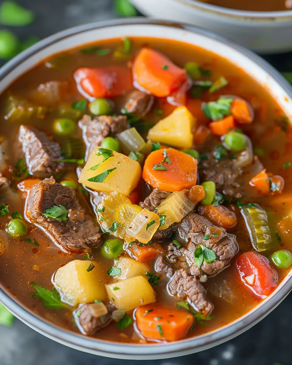 A comforting, hearty soup loaded with vegetables and beef, perfect for family dinners.