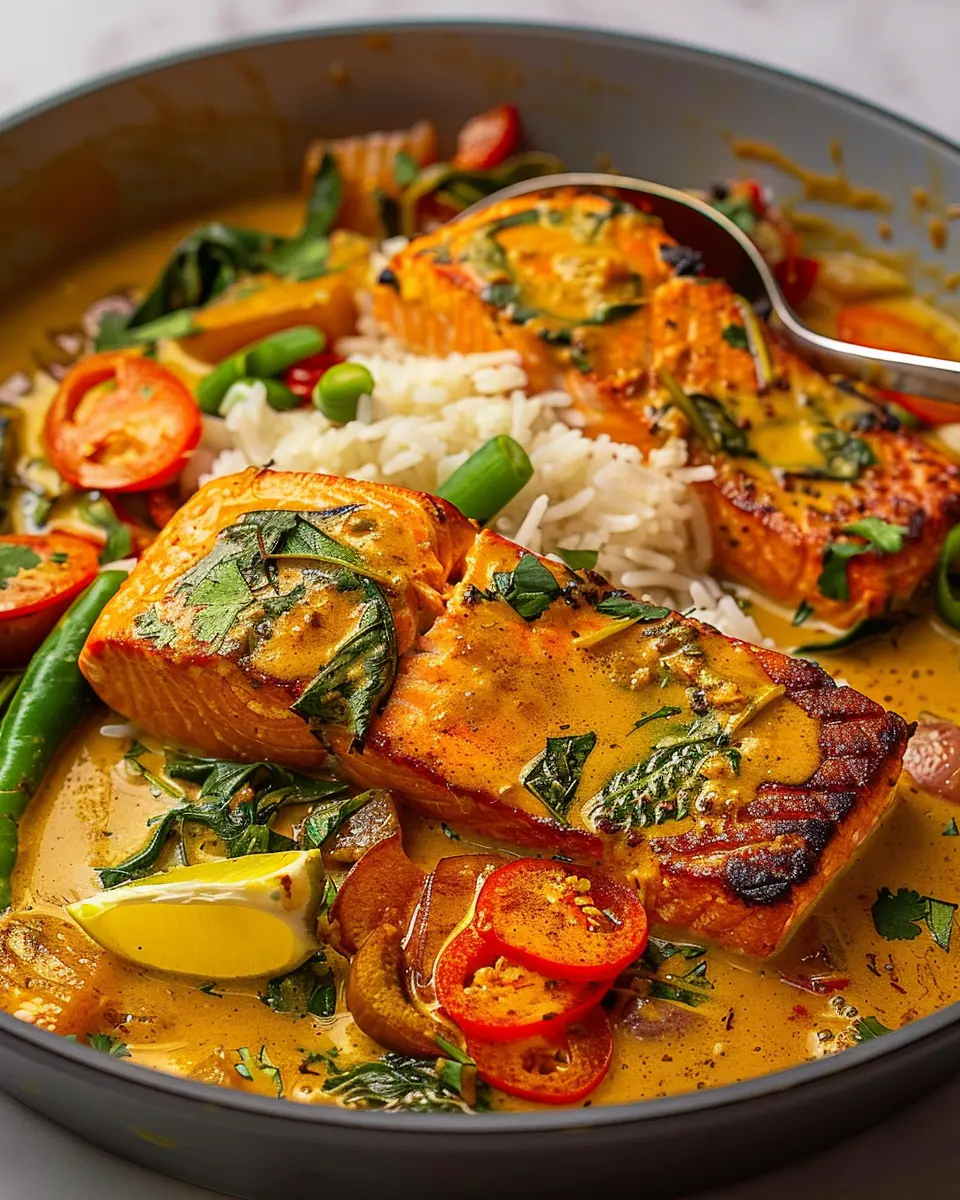 Finally, return the salmon fillets to the pan, spooning the rich sauce over them. Cover the skillet and let everything cozy up for another 5 minutes on low heat. The idea here is to ensure the salmon reheats gently in the fragrant curry without becoming overcooked.