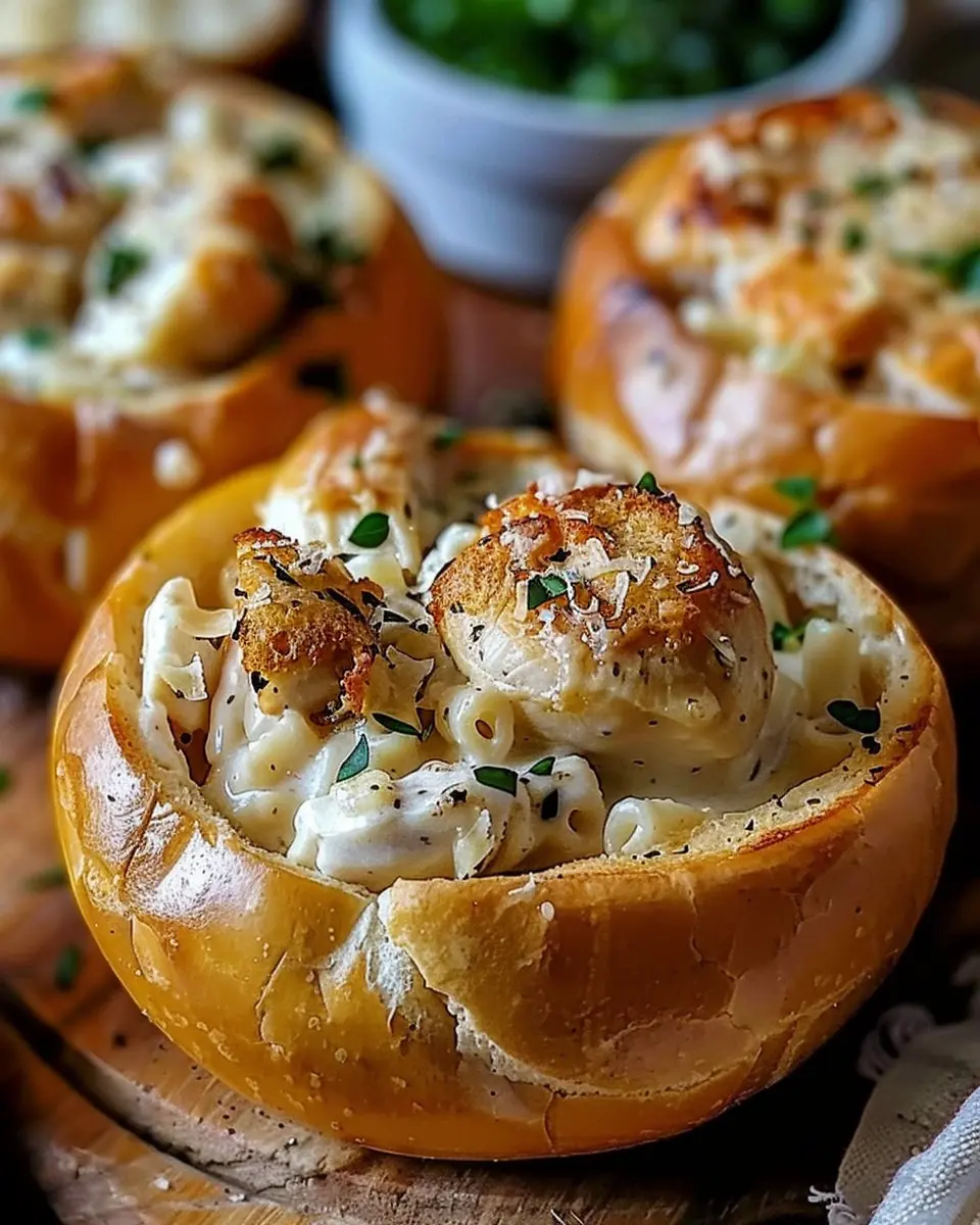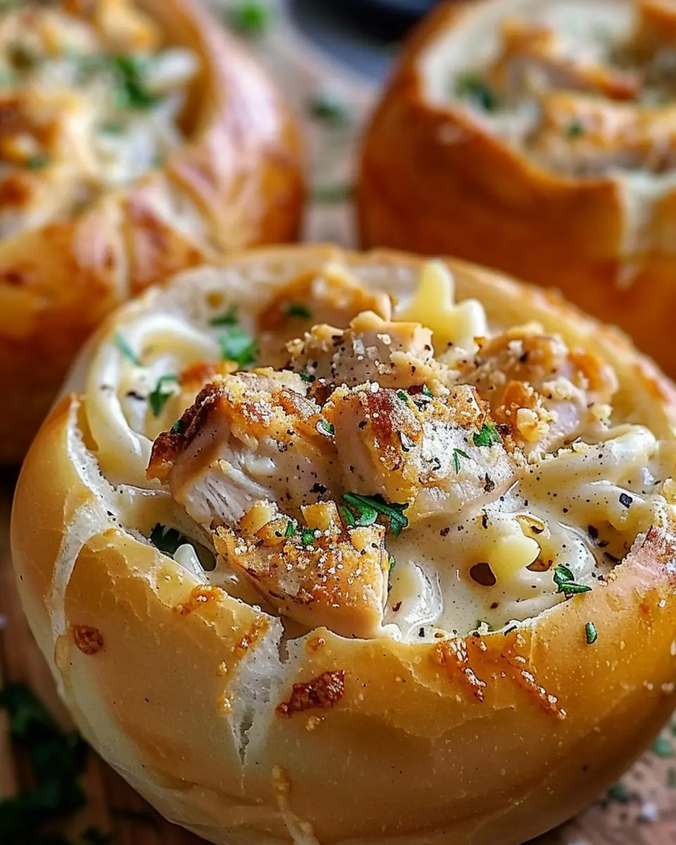 Enjoy the delightful combination of creamy chicken Alfredo served in a crispy garlic bread bowl, perfect for an easy and comforting meal.