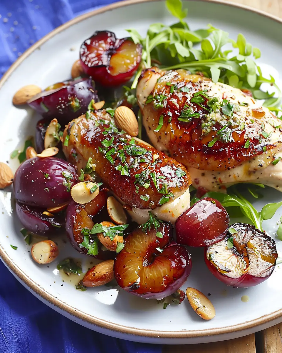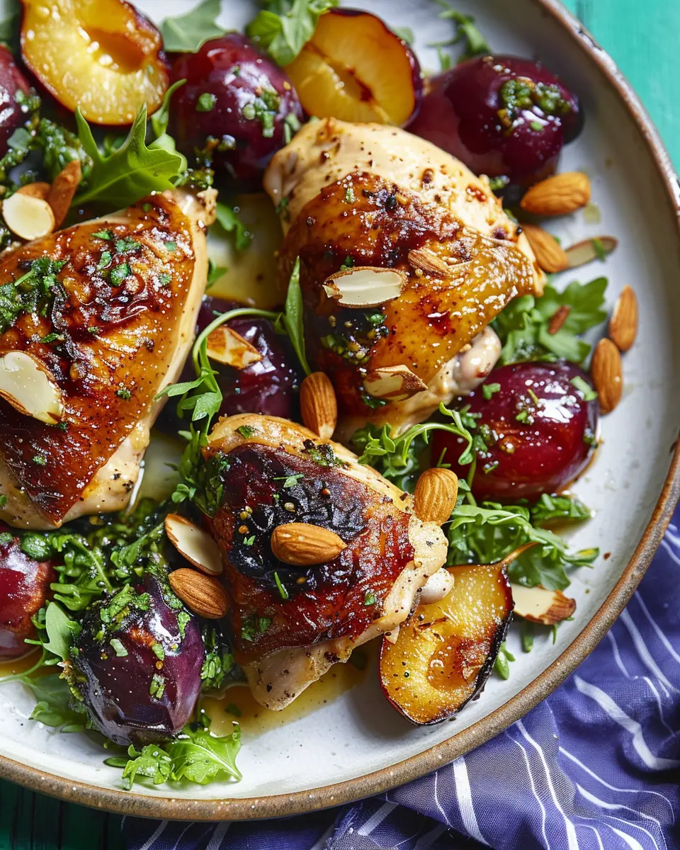 Plate the chicken beautifully alongside the roasted plums, and sprinkle the almond gremolata on top. This dish isn’t just about nourishment; it’s a feast for the eyes as well.