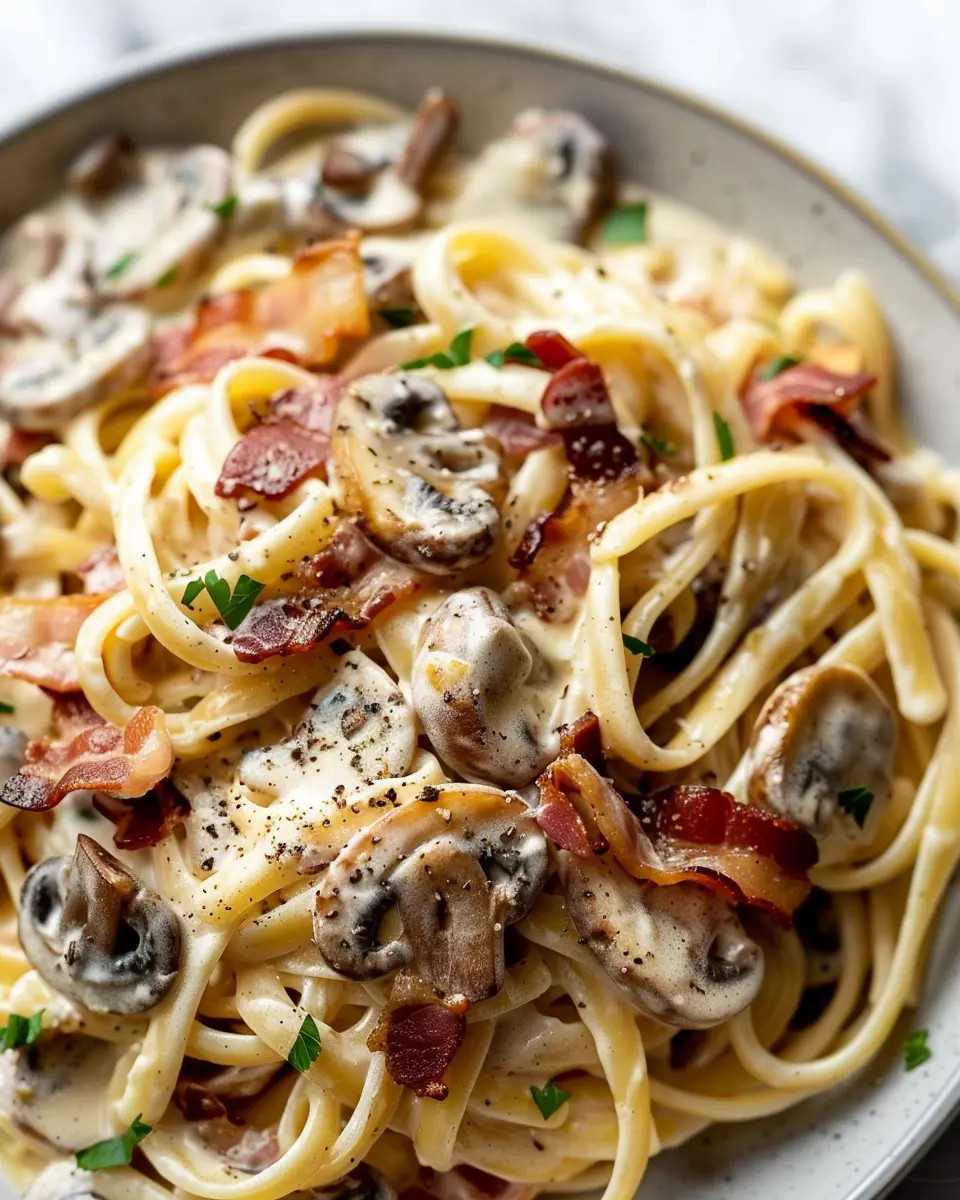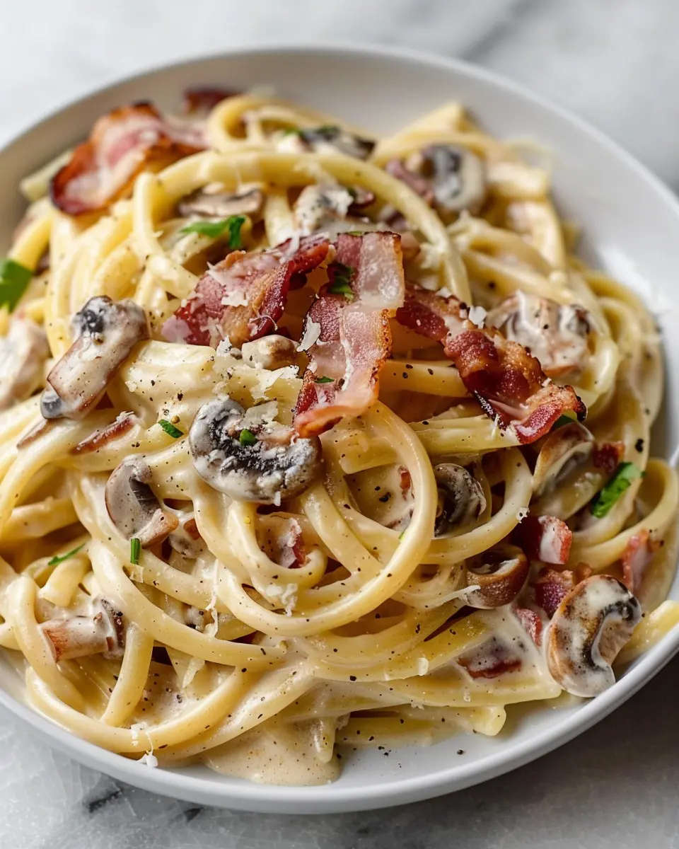 A deliciously rich and creamy pasta dish featuring turkey bacon and mushrooms.