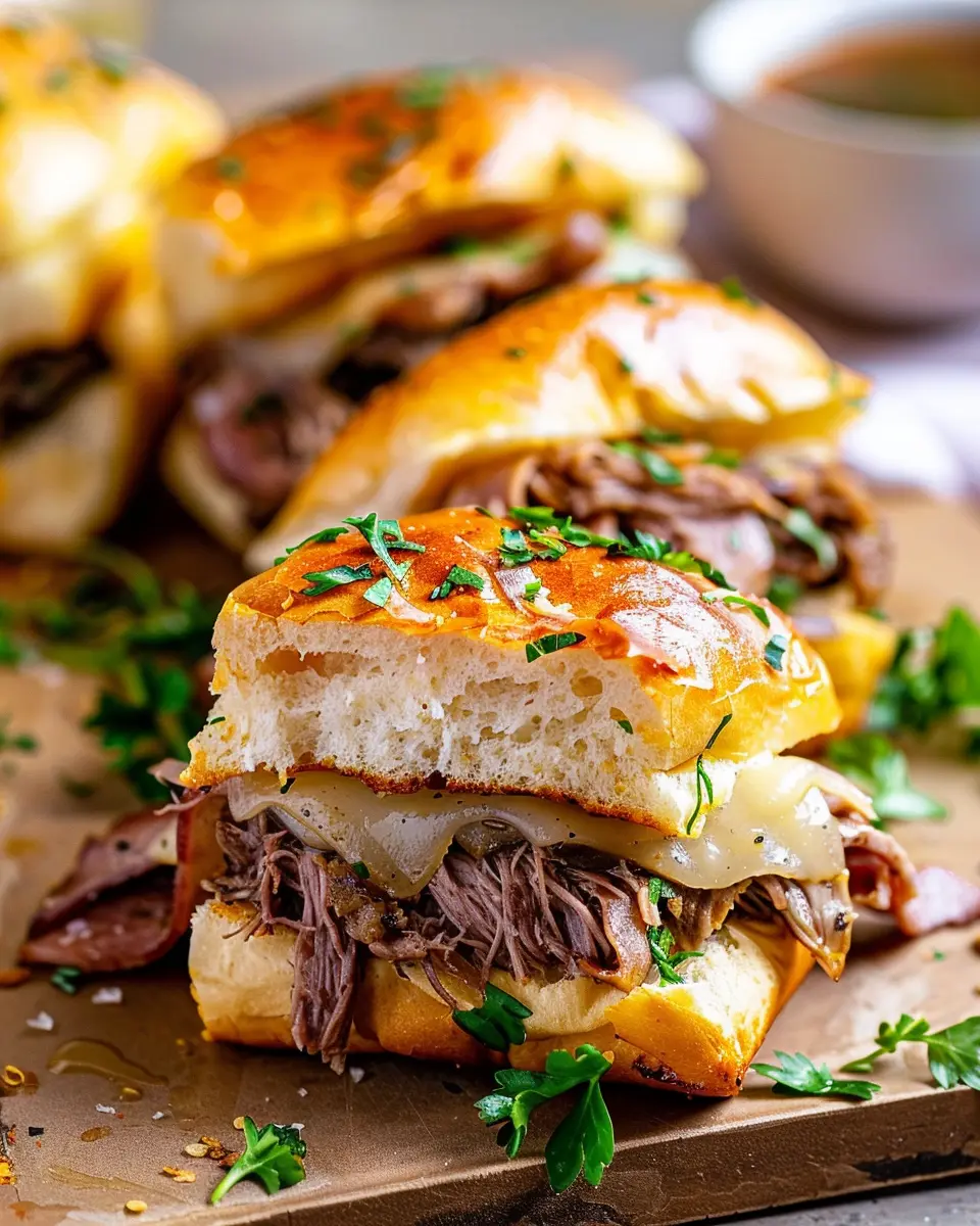 • Minimal Ingredients: All you need are some hearty rolls, juicy beef, flavor-packed broth, and a few spices. Swap in turkey bacon or chicken ham, and you’re on your way to creating a versatile dish.