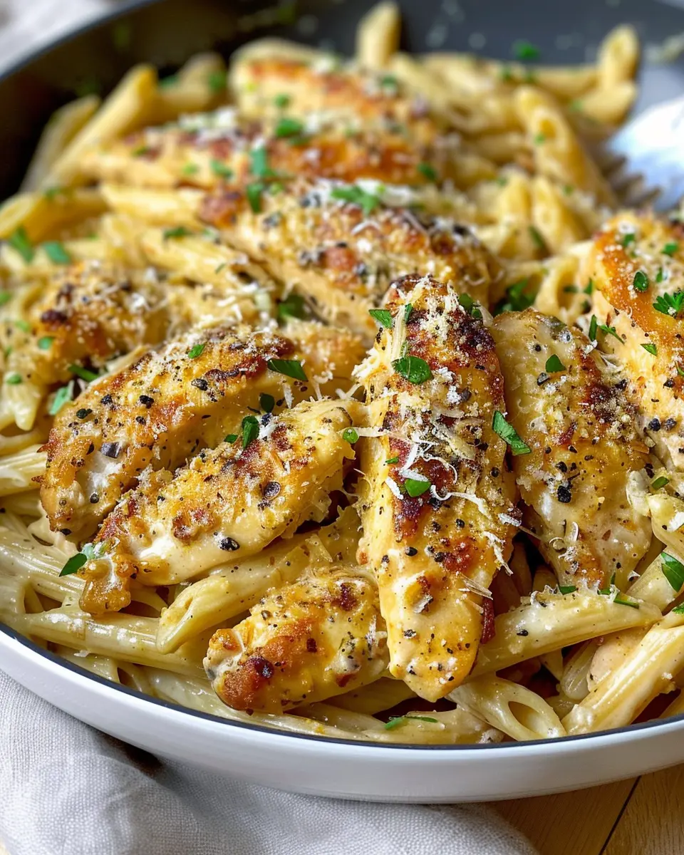 Finally, slice the chicken into strips and add it back into the skillet with the pasta. Gently toss everything together until well combined. Now, you’re ready to serve! Garnish with freshly chopped parsley for a pop of color and a hint of freshness.