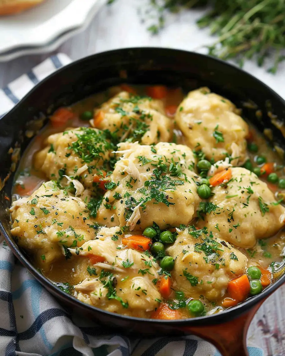 Simply blanch your chosen veggies in hot water before adding them to the pot. This step ensures they retain their crunch while absorbing the dish’s flavors. For extra flair, top the dumplings with a sprinkle of fresh herbs before serving. The combination of hearty chicken, fluffy dumplings, and crisp veggies is pure magic.